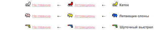 Стрелки и иконки смотрят не туда. Непонятно, почему меняются обозначения ссылок «Аттракционы» и «На главную». Вместо «На главную» надо написать «Главная» или вообще убрать эту ссылку.