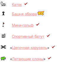 Работающие аттракционы у вас обозначены навязчивыми галочками . Лучше обозначить неработающие бледной или серой ссылкой. Посещенные ссылки лучше делать привычно‑лиловыми.