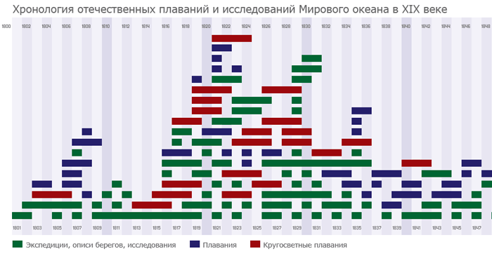 Было бы здорово, применяя принципы параллельного изложения, показать в одном месте плотность и продолжительность плаваний, их географию по десятилетиям, имена капитанов, названия кораблей и даже их внешний вид, который продемонстрирует технический прогресс и постепенный переход к пароходству: