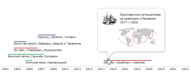 Задача: показать количество, продолжительность и плотность отечественных плаваний. Наводя курсор на цветной прямоугольник получаем подпись (кто, на каком корабле, куда и зачем).