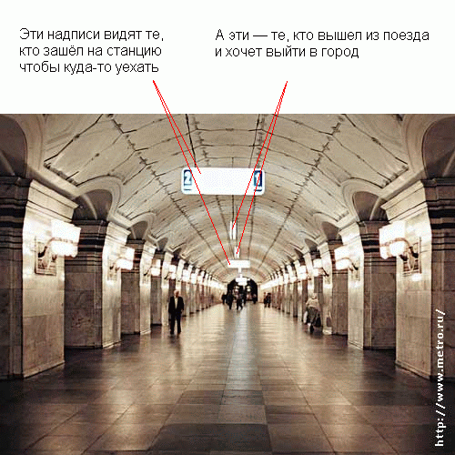 Мне кажется, Артем не вполне прав, отвергая цифровую систему кодирования выходов. Заранее человек узнает о существовании выхода 2В от того, кто назначил ему встречу, из карты проезда, из путеводителя и т. п. Этот вопрос не будет стоять при повсеместном применении. И это уж точно куда удобнее, чем назначать встречу словами «выход из первого вагона из центра, по переходу направо, третья лестница слева». |