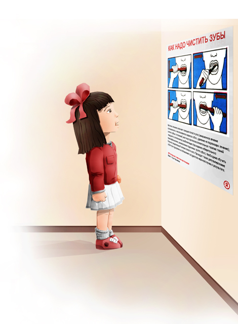 Чтобы сделать его интересным, как предложил комментатор выше, можно сделать как в старых детских книжках — вырезать щетку, а во рту сделать прорезь, и чтобы каждый мог этой щёткой поводить по чётко заданной траектории. Плакат получится интерактивный и запоминающийся.