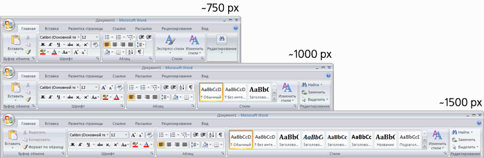 Например, кнопка в Ворде, вызывающая меню стилей, на широких мониторах превращается в само меню, и чем шире монитор, тем больше стилей там доступно.