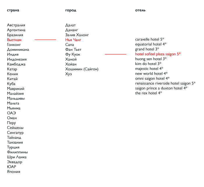 А вот в списке отелей «звездочки» стоит ставить перед названием — людям в большинстве случаев они важнее. И выровнять названия так, чтобы число звезд легко считывалось.