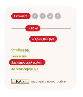 Выбор числа комнат: красиво, конечно, но радиокнопки будут постоянно менять свое положение (из-за приписки «комнат»). Бегающие кнопки — не лучшее решение, хотя, может, и приемлемое.
