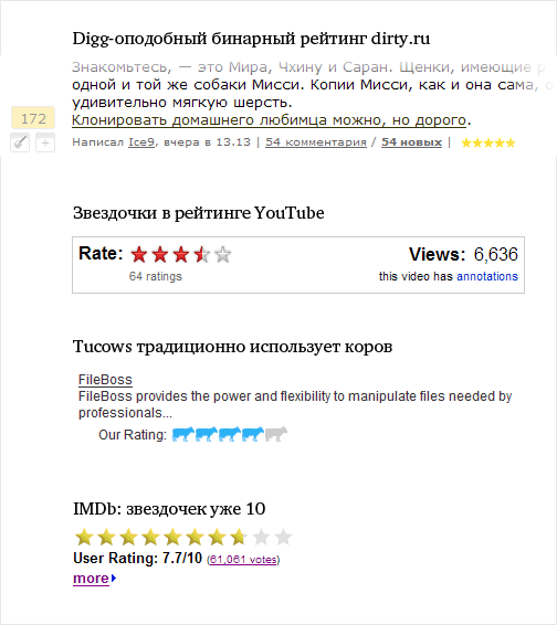 На рисунке ниже несколько примеров. Рейтинг со звездочками хорош тем, что видны границы. Пример Артема со смайликами этого преимущества лишен. Зато в рейтинге со звездами не видна разница близких значений. Другой тип — +/− голосование. Больше подходит там, где нужно выразить оценку категорично: записи в блогах, рейтинги песен, картинки. Здесь градации ни к чему.