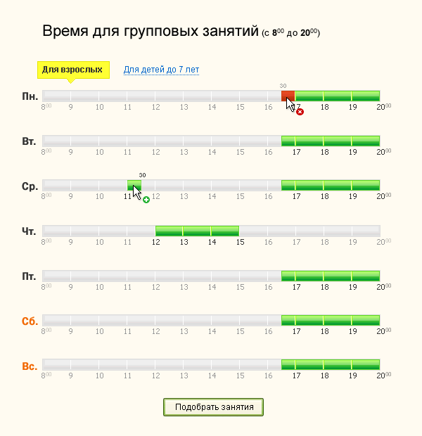 Если это инструмент подбора групповых занятий в свободное для посещений время, то где эти самые групповые занятия? Тут только временная шкала.