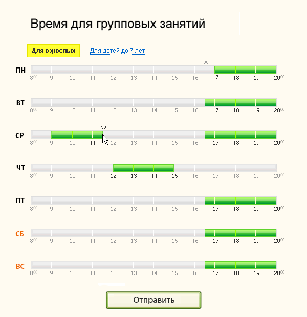 Дмитрий, не исключено, что, введя предположительно удобное время, взрослый мужик получит на выбор пилатес, йогу и модельный шаг. Мне кажется, вместо выбора времени лучше сделать простое расписание занятий.