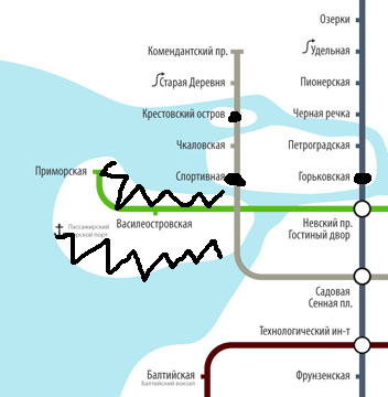 Схема ничего, но не понравилось масшатабирование. Зеленая ветка заканчивается значительно ниже, чем оранжевая, примерно раза в два дальше от центра, и намного ближе к Неве. Мне |
