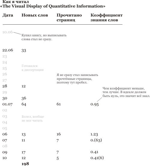 А я не понимаю смысл ведения столь подробной статистики. Вы, наверное, читаете достаточно много иноязычного текста, так почему бы не обойтись таким представлением: