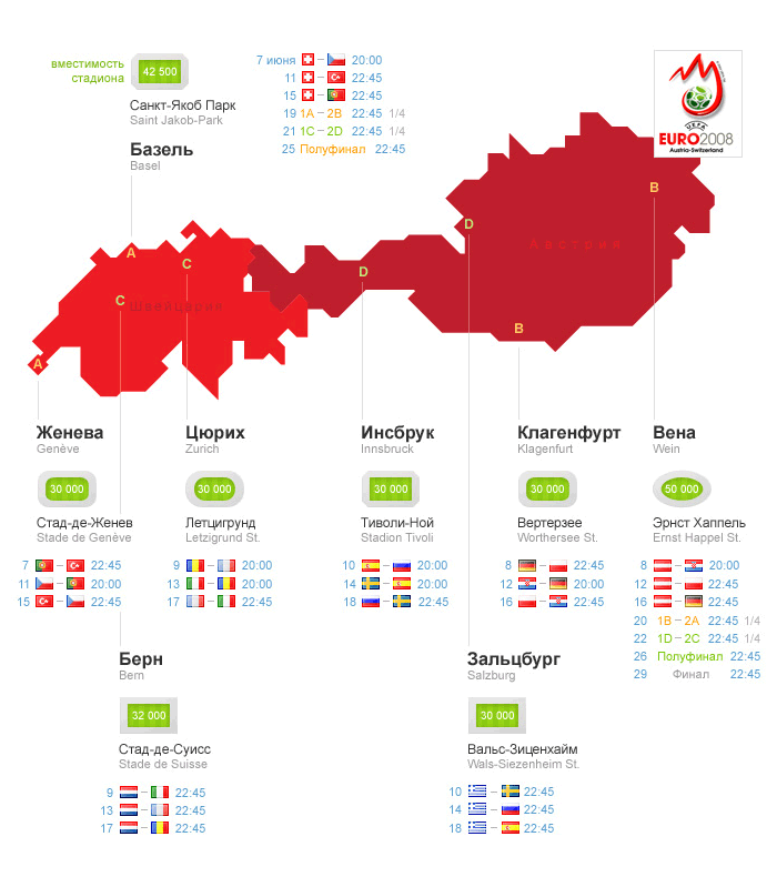 Чтобы болельщик не путался в датах, можно составить общую хронологию игр. Это решает две проблемы: хаос в расписании обретает неожиданную логику, а во-вторых, игры, объединяясь, в некотором смысле противопоставляются карте, которая и вправду оттягивает внимание. Впрочем иконок стадионов (См.комментарий Павла Власова) последнее тоже касается; теперь их можно сравнивать, уже что-то.