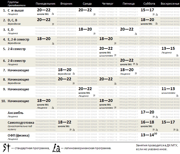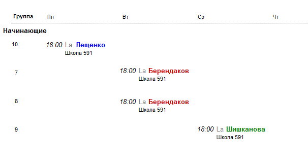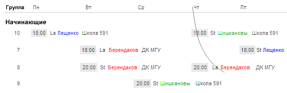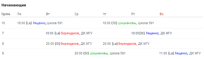 Я исхожу из предположения, что расписание нужнее всего начинающим, которые выбирают себе удобную группу. В этом случае задача — сравнить расписание групп и соотнести его с представлением о собственной рабочей неделе. |