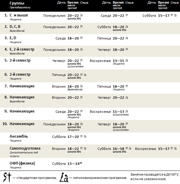 Здравствуйте. У меня есть такое расписание занятий бальными танцами. С кислой миной на лице я им пользуюсь уже два года и понимаю, что можно сделать лучше и гораздо проще. Дайте, пожалуйста, совет. Спасибо. |