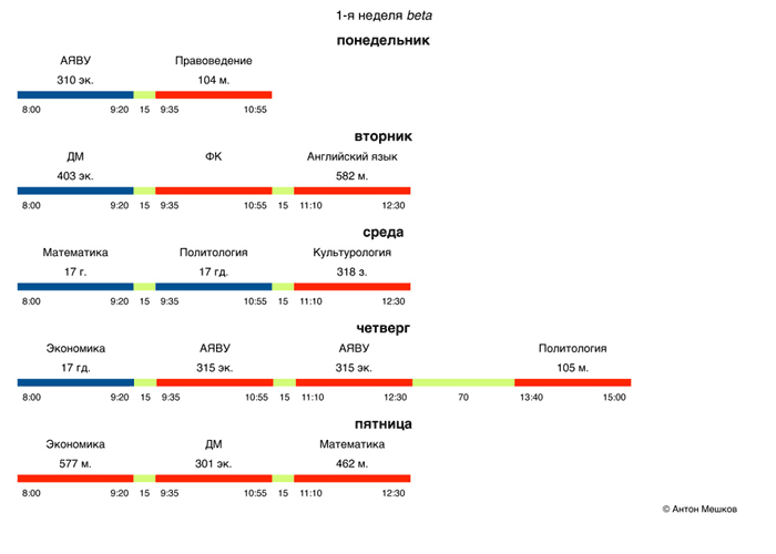 Артем, вы никак не отметили практики и лекции, мне кажется, это недочет. Вопрос в том, какой способ выделения наилучший? Делая свое расписание, я обводил практику в рамочки, но это, возможно, не лучший вариант.