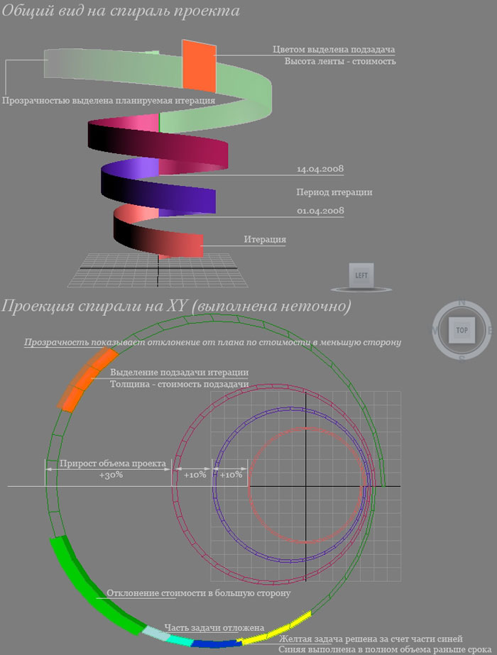 Проекции спирали должны сопровождаться дополнительной информацией — длительность каждой задачи в рамках итерации, ее стоимость, исполнители, расхождение плановых и фактических значений и т. д. (много чего можно придумать!). Частично эта информация приведена на второй фигуре.