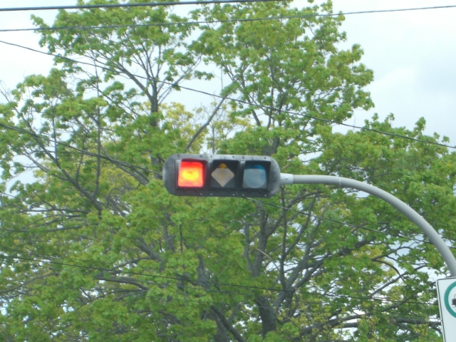 Этот светофор имеет только один квадратный глазок. И с первого взгляда становится ясно, кому в данный момент принадлежит право проезда на перекрестке. (Помните трамвайный светофор?)
