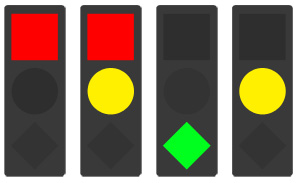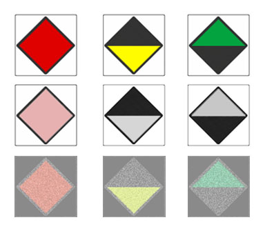 Гораздо логичнее делать ромбом зеленый, чтобы различия между красным и зеленым было максимальным (ведь это — основная причина ввода кодирования формой). При свечении квадрат и круг слишком похожи.