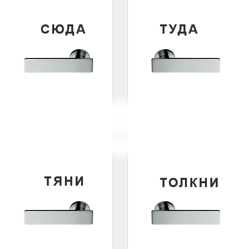 А как избежать ошибок с той стороны, где ручка? Очень часто ручку будут пытаться толкать. Только вчера видел, как девушка ломится в дверь, толкая ручку. Да и по себе знаю, что такие ошибки случаются.