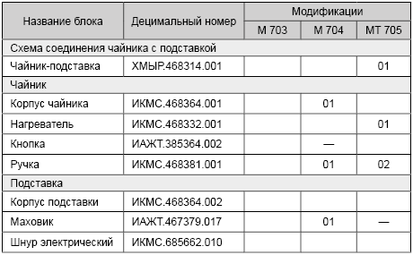 М703, М704, МТ705 — модификации, корпус чайника, нагреватель и т. д.— блоки. Модификаций может быть много, блоков — ещё больше!