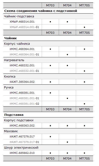 Корпус чайника M-703 у вас использует базовый номер, затем -01, а после снова базовый. При этом для MT-705 вы пишете «тот же», хотя он вовсе не тот же (не такой как для M-704). Это тянет на еще одну приписку для новичков.