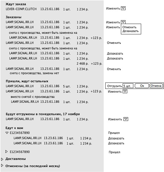 Получается, что о заменах мы узнаем в момент заказа к поставщику, а о том, что в посылке, только после прихода запчастей на склад компании Если заказ большой, поставщик может отправлять запчасти партиями. Менеджер связывается с клиентом, информирует его о том, что уже пришло на склад и может быть ему отправлено.
