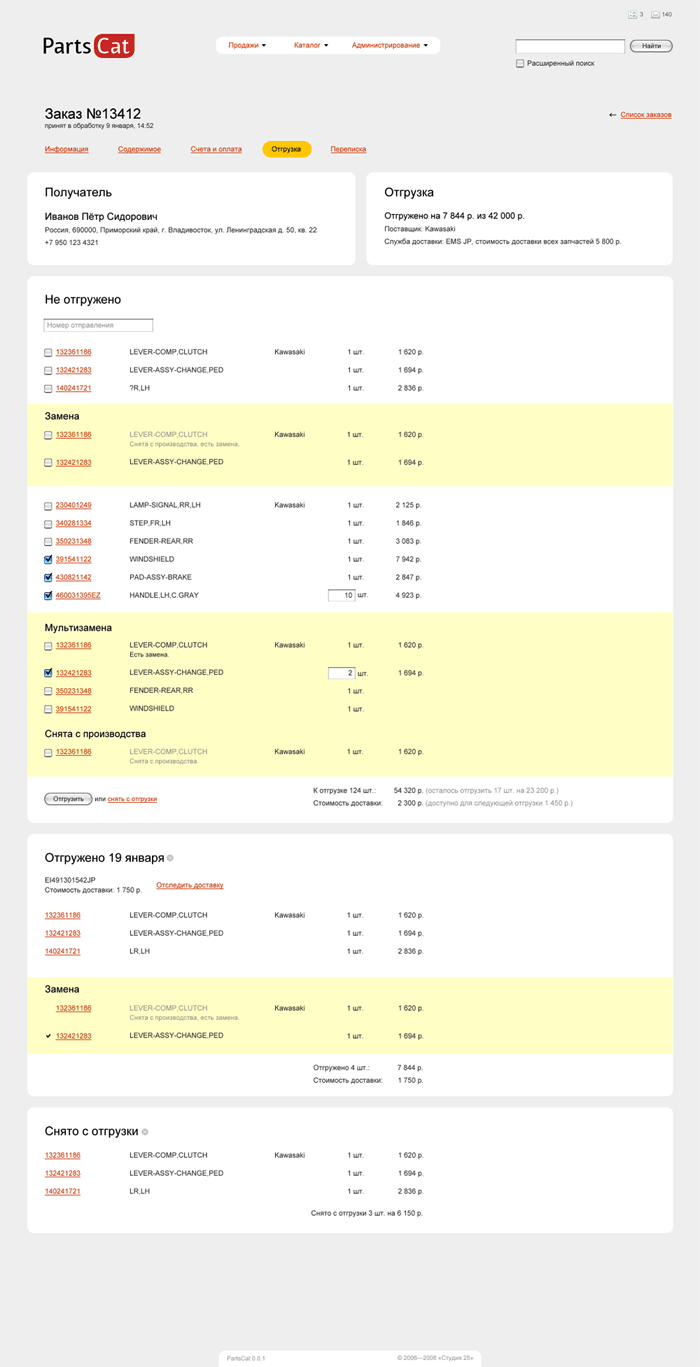 Здравствуйте, коллеги! Нужно разработать интерфейс администрирования Краткая схема работы магазина: клиент выбирает запчасти по каталогу и заказывает их. Менеджер после получения оплаты делает заказ поставщику. После прихода на склад запчасти отправляются клиенту службой доставки, которую клиент выбрал при оформлении заказа. Об отгрузках: каждой посылке присваивается номер отправления, по которому клиент или менеджер сможет отследить местоположение заказа. Запчасти могут быть сняты с производства и заменены на более новые, об этом можно узнать только после заказа к поставщику, а точнее, после прихода запчастей на склад компании. Т. к. поставщик информирует, что запчасти будут заменены на новые, но может отправить и старые, если были запасы на складе.