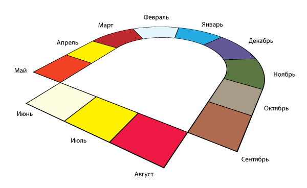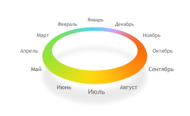 Для меня лично Год — окружность. Сверху зима, слева весна, снизу лето, справа осень. Зима белая, весна голубая, лето зеленое, осень желтая, оранжевая и красная.