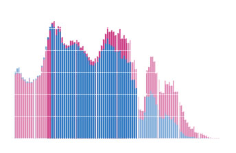 Мне также показалось, что на старой схеме лучше видна асимметрия между мужчинами и женщинами после 60 лет, в вашем же варианте цвет мужской части темнее, что даёт больший вес при равной площади, плюс на старой схеме возрастные группы разделены. Ваша схема немного «приукрашивает» ситуацию.