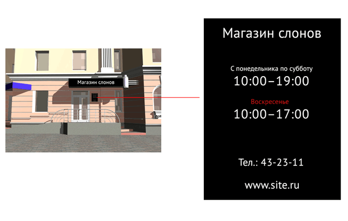 Здравствуйте, Артём. Меня интересует ваша оценка дизайна маленькой вывески. Попрошу оценивать не с точки зрения графического исполнения, а с точки зрения идеи и грамотности. Например, правильно ли использовано короткое тире в диапазоне времени? |