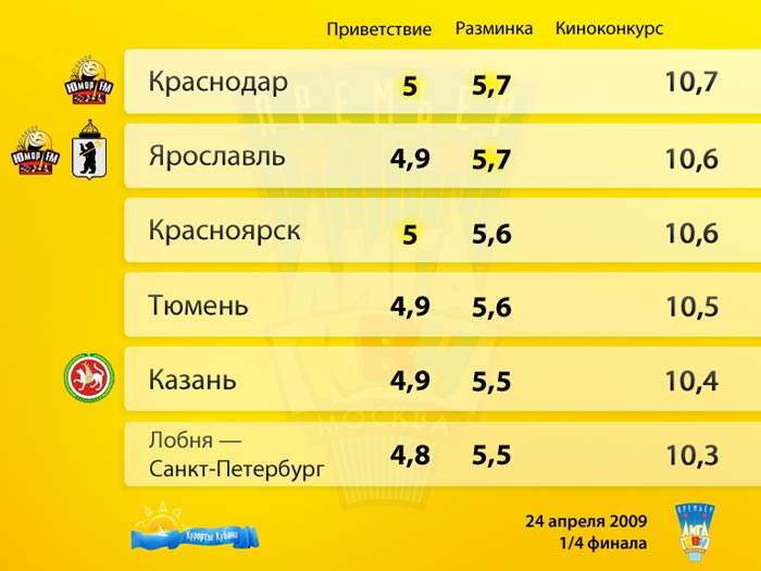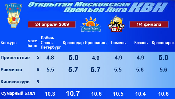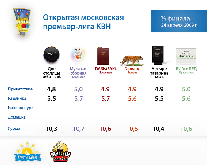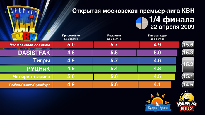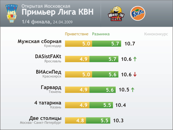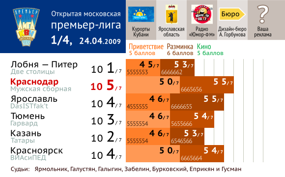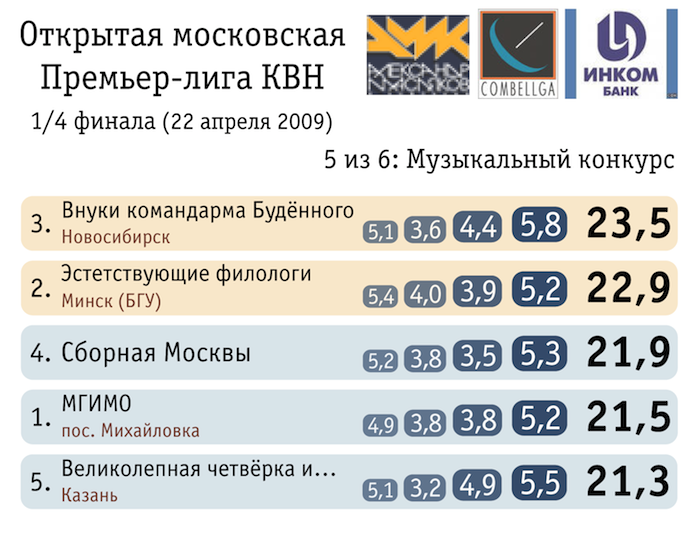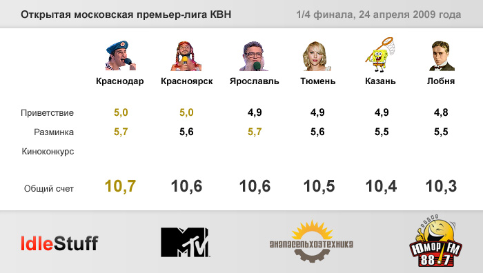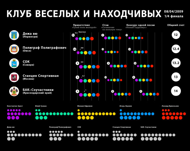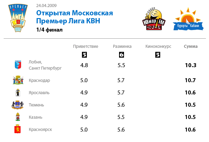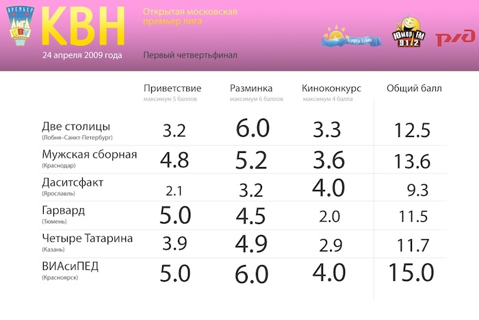Многие просто взяли и вычистили эту картинку от «информационного мусора» в виде запятых. Сделали беленьким фон, хотя вы себе представьте у себя на экране телевизора таблицу с белым фоном, вы смотрели шоу, и тут хоп — вам какая-то настроечная таблица. Все слишком увлеклись вычищением графиков и таблиц для сайтов и книг. Да, может, дата на экране и не полезна, но я смотрю игры в записи, и, бывает, пригождается, чтобы знать, какая по очереди 1/8, и трансляция игр отстаёт от эфира недели на две. Сейчас уже три игры прошло, а показали только первую. Но это уже мелочи, которые, возможно, и в самом деле стоит выбросить (хотя вместо 24.04.2009 можно написать 24 апреля 2009, правда?) Наверняка правильно выкинут и максимальный балл за конкурс, как и порядковые номера конкурсов и команд.