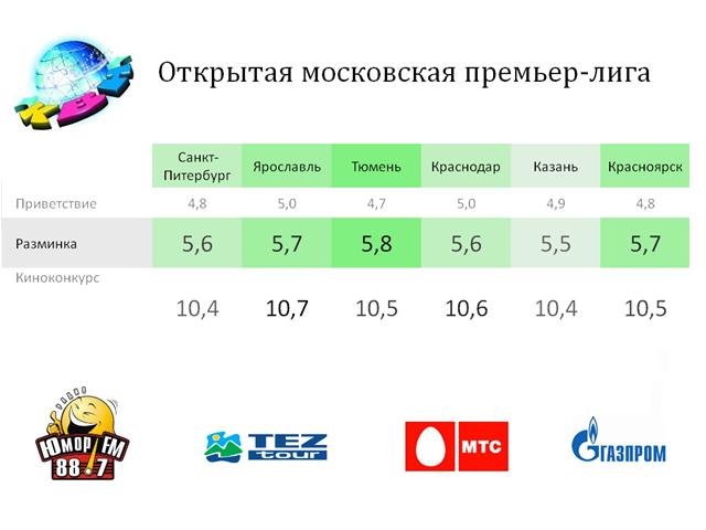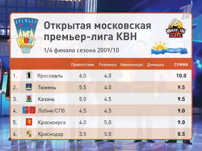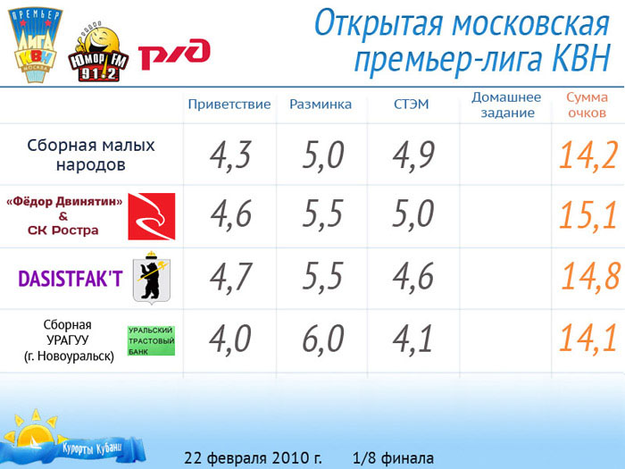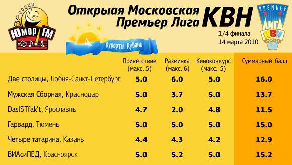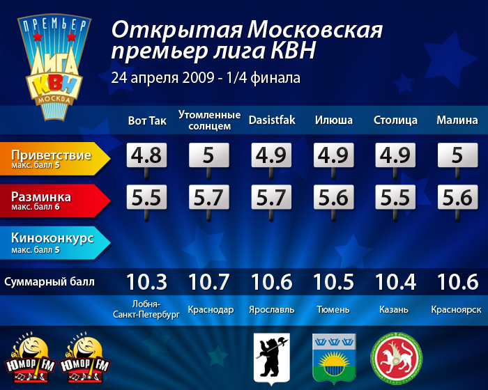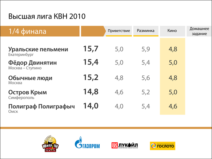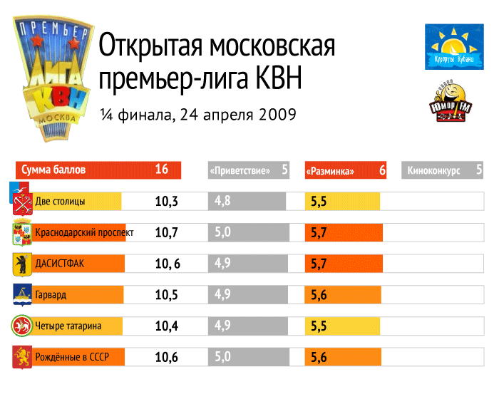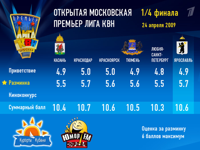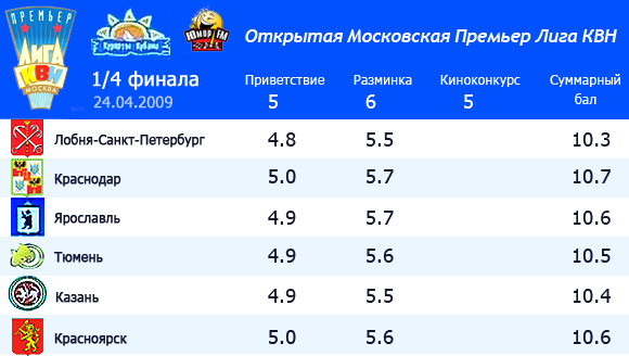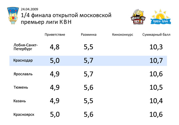 Многие просто взяли и вычистили эту картинку от «информационного мусора» в виде запятых. Сделали беленьким фон, хотя вы себе представьте у себя на экране телевизора таблицу с белым фоном, вы смотрели шоу, и тут хоп — вам какая-то настроечная таблица. Все слишком увлеклись вычищением графиков и таблиц для сайтов и книг. Да, может, дата на экране и не полезна, но я смотрю игры в записи, и, бывает, пригождается, чтобы знать, какая по очереди 1/8, и трансляция игр отстаёт от эфира недели на две. Сейчас уже три игры прошло, а показали только первую. Но это уже мелочи, которые, возможно, и в самом деле стоит выбросить (хотя вместо 24.04.2009 можно написать 24 апреля 2009, правда?) Наверняка правильно выкинут и максимальный балл за конкурс, как и порядковые номера конкурсов и команд.