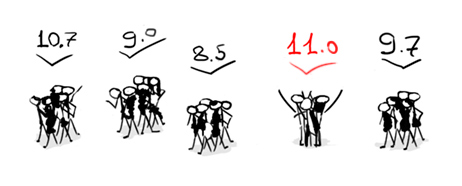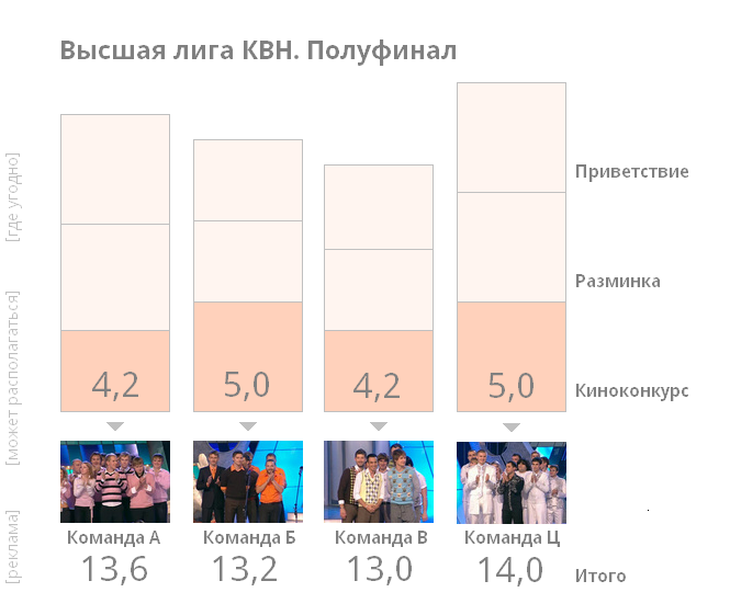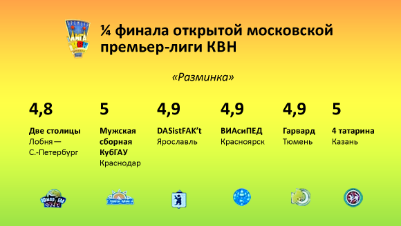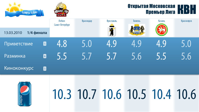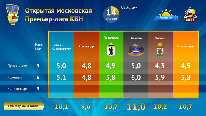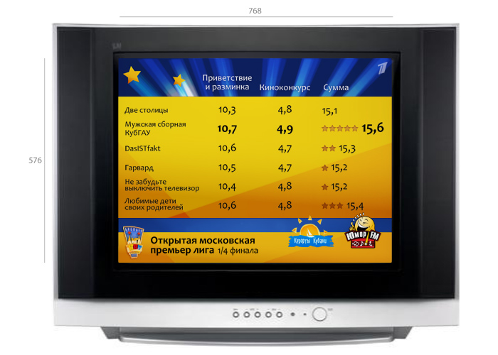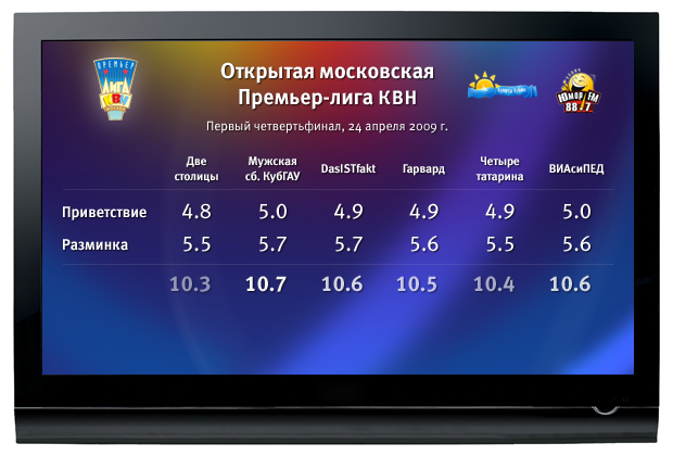Но самая основная проблема, что советчики не смотрят КВН, и даже не захотели его посмотреть разок, чтобы понять, какую задачу они будут решать (что удивительно для дизайнеров). Представленный формат результатов был только для Премьер-лиги, где жюри советуясь выставляет оценку команде за конкурс, и информация выводится как на исходной картинке. В Высшей же лиге сидят обычно 5-7 человек в жюри, и каждый выставляет оценку, и они все выводятся на экран, и выставляется средний балл за конкурс, и показывается суммарный балл за игру. Команд, если что, обычно играет не больше 6, и это, как правило, в 1/8 играх вышки или в премьерке почти весь сезон. Но больше 6 команд не играет, по времени больше команд не успеет выступить.