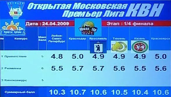 Уже лет десять я поражаюсь тому, насколько жутко в КВНе сделан экран с оценками. Не то чтобы там нужны были какие-то серьёзные улучшения, скорее, переделывать надо всё.