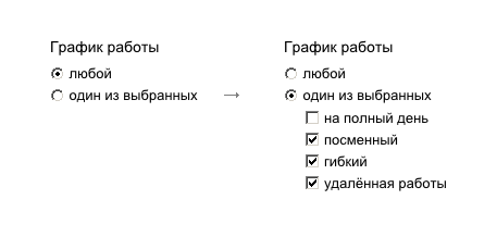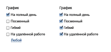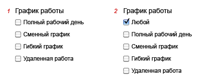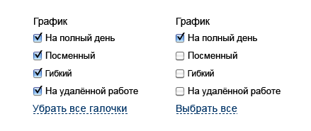 Здравствуйте! Хотелось бы раз и навсегда разобраться с блоками ограничивающих параметров, которые так часто встречаются в формах, например, расширенного поиска. Цель: увидев весь спектр результатов, сузить его, явно указав одну или несколько категорий для отображения. Сейчас речь идёт не о контекстных фильтрах рядом с выдачей Как это может работать: 1) мы не говорим, а подразумеваем, что при всех снятых чекбоксах пользователь увидит всё; 2) мы вводим искусственный чекбокс Я за первый вариант, второй мне кажется слишком надуманным |