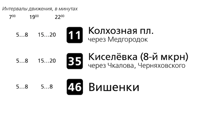 Я не очень понимаю, какой смысл в точных интервалах движения в случаях, когда они отличаются на пару минут. Не хватает возможности отобразить «интервал на весь день».