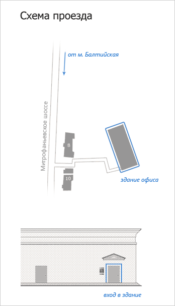 Нужное здание на верхней картинке и вход на нижней картинке стоит выделить одним цветом. Той же голубой обводкой, к примеру.