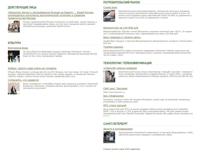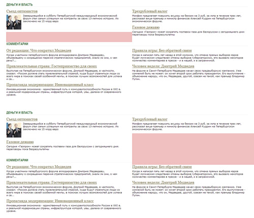 — во второй группе (новости технологий и телекоммуникации) следовало бы слева расположить одну новость с картинкой, а одну без неё, и точно так же справа, что предотвратило бы неизбежное перетягивание внимания к левой колонке с картинками.