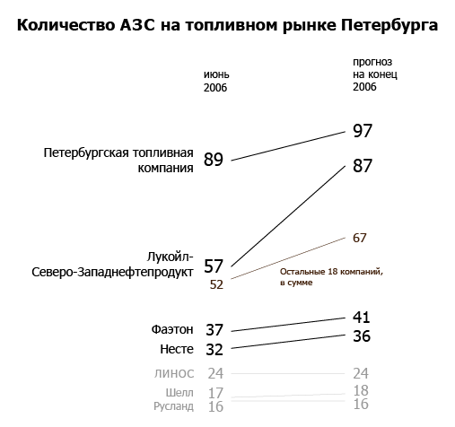Исходная статья знакомит нас с ситуацией на топливном рынке Питера на июнь 2006-го и сообщает о планах игроков рынка на конец года. Цель статьи — показать кто вообще есть на рынке, показать доли участников и дать возможность сравнить их.