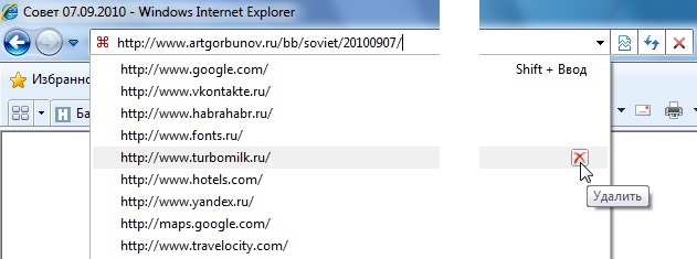 В «Интернет-эксплорере» список набранных адресов позволяет удалять из списка ненужные пункты. Например, для неправильно набранных адресов может быть полезно.