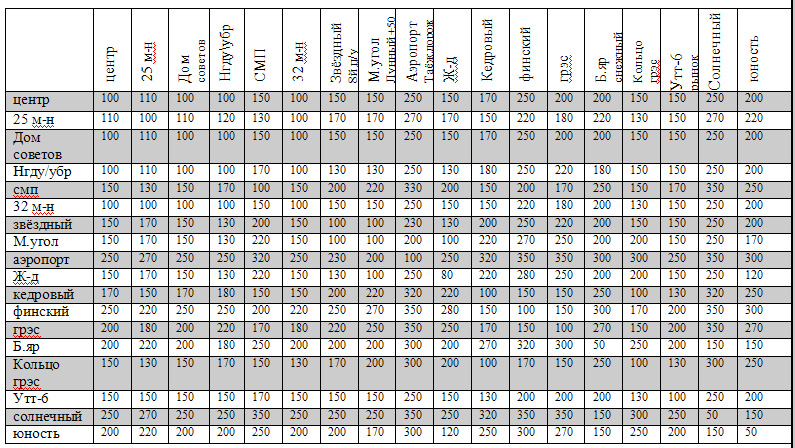 Пользуясь тем, что таблица почти всюду симметрична, можно убрать половину чисел (например, все, что ниже главной диагонали, идущей из левого верхнего угла в правый нижней). Редкие случаи нарушения симметрии (например, из НГДУ/УБР в 25 м-н ехать дешевле, чем обратно), если это не опечатки, можно описать отдельно.