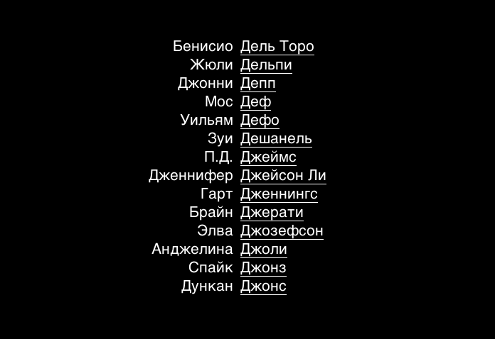 Можно ведь по фамилии выровнять. Будет титры из голливудских фильмов напоминать. Списку актёров и режиссёров приятно.