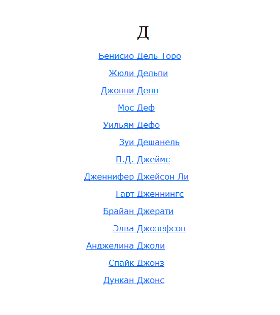 Стоит задача вывести алфавитный список актёров/режиссёров. С одной стороны, логично их упорядочивать по фамилиям, так как они более разнообразны, с другой, все привыкли произносить их как «Джонни Депп» и «Бред Питт», а не «Депп Джонни» и «Питт Бред». То есть, если выводить имена как привыкли (слева), не очень понятно, как в таком списке искать, а если выводить фамилию первой (справа), принцип сортировки понятен, но трудно узнать знакомое имя.