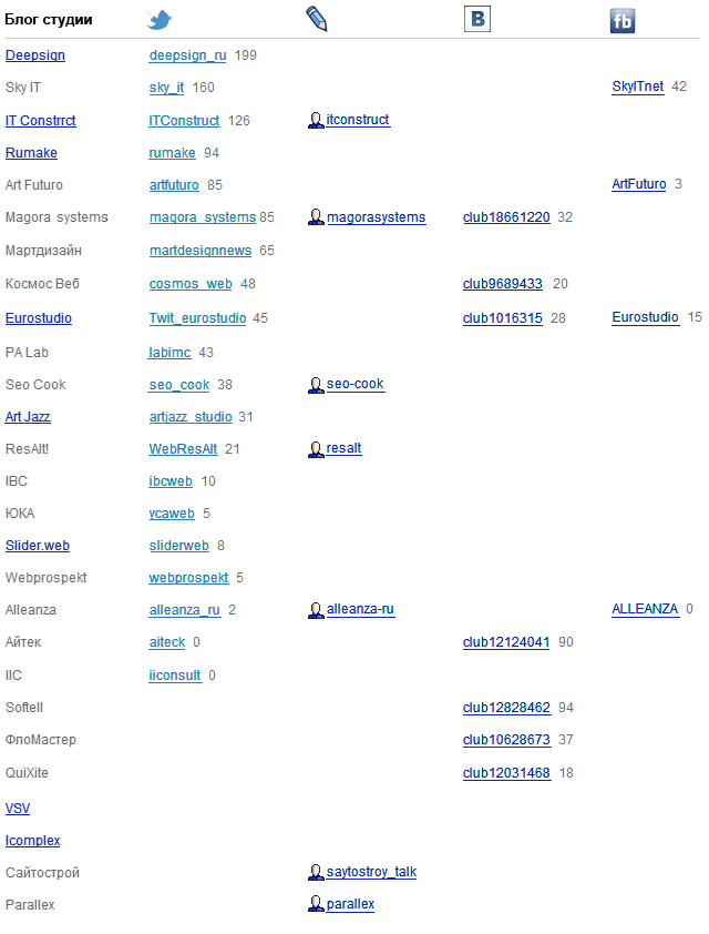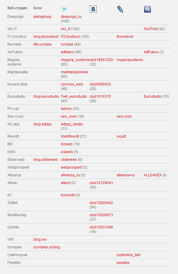 Нужен совет. Есть вот такая таблица, описывающая наличие у новосибирских веб-студий блогов и страничек в различных социальных сетях. Как мы с ней ни боролись, получается не совсем приятная картинка. Больше всего удручает неоднородность данных. Как, на ваш взгляд, можно улучшить эту табличку? Необходимо учитывать, что ширина таблицы фиксированная.