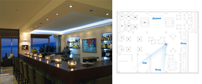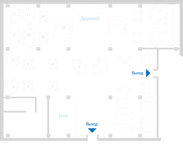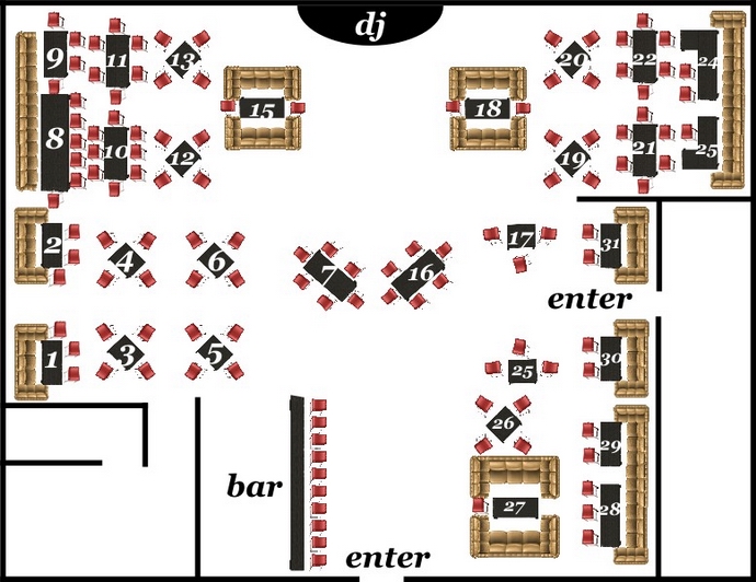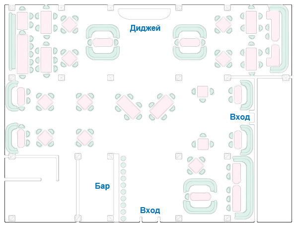 А про схему: номерки столов нужны только официантам и барменам. Да и они наизусть должны помнить. Убрал. А для посетителей отделил цветом столы и стулья от пола стен и колонн.