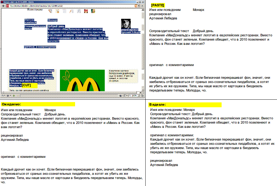 Думаю, одной иерархией тут не отделаться: даже при суперсемантическом коде каждый браузер скопирует в буфер Главный вопрос в другом: зачем это надо? Какой смысл читать Соглашусь, в некоторых случаях хотелось бы, чтобы копировалось немного не так, как оно копируется. Но усилия, которые понадобились бы, чтобы предусмотреть это на всех сайтах, несравнимо больше той пользы, которую они принесут. Предлагаю относиться к этому как к версии для печати. Обычно про неё не стоит думать вообще, пускай браузер сам печатает как умеет. Но если мы знаем, что для пользователей важна возможность печатать нашу страницу, то мы, конечно, должны убедиться, что всё печатается хорошо. И, если мы знаем, что пользователи часто копируют текст с нашей страницы и вставляют |
