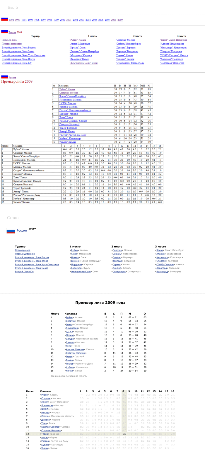 Выпадающий список выбора года неудобен и неинформативен. Раньше было видно, в какие годы проводился чемпионат и можно посчитать, сколько их было и какой порядковый номер у каждого. Не очень удобно, но информация всё же была.