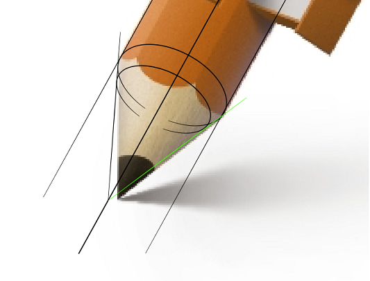 Интересно, обратили ли вы внимание на заточку карандаша: как будто грифель смещён относительно оси карандаша (сравните дуги у грифеля и у металлического держателя ластика). Это может быть сделано, чтобы приблизить картинку к реальности, но тогда вместе с этим нужно «подпортить» идеальную конусоподобную заточку.