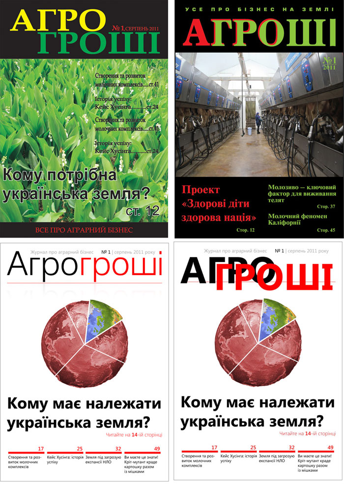 Есть несколько вариантов обложек, сделанных разными людьми, для нового украинского журнала «Агрогроші». Ясное дело, что подготовлены они были непрофессионалами. Но выбрать всё-таки что-то нужно.