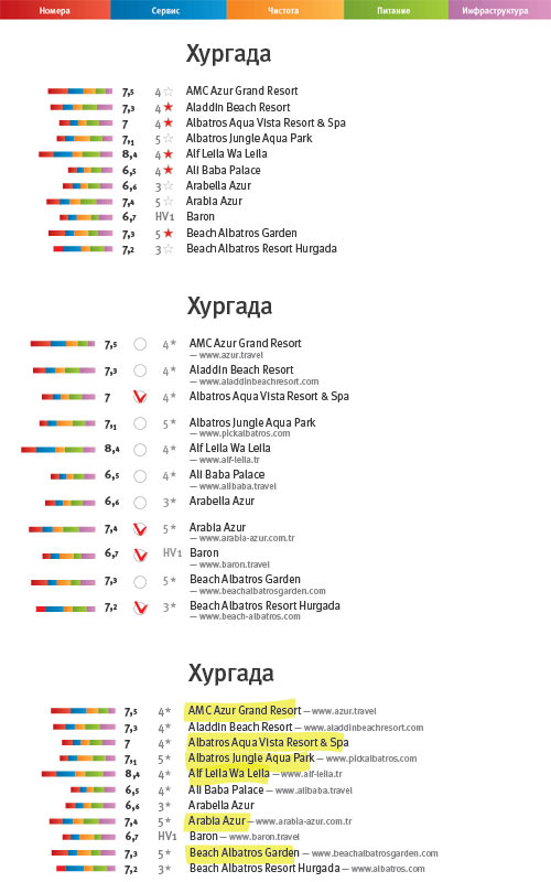 1. Мне кажется (хотя я, в основном, сталкиваюсь с подобными списками, как клиент турфирм), что надо разбить на блоки по звёздности: чаще всего я знаю, сколько звёзд меня устроит, а остальные отели будут для меня мусором, сквозь который придётся продираться. И нарисовать тогда, конечно, количество звёзд, а не писать 5*. |