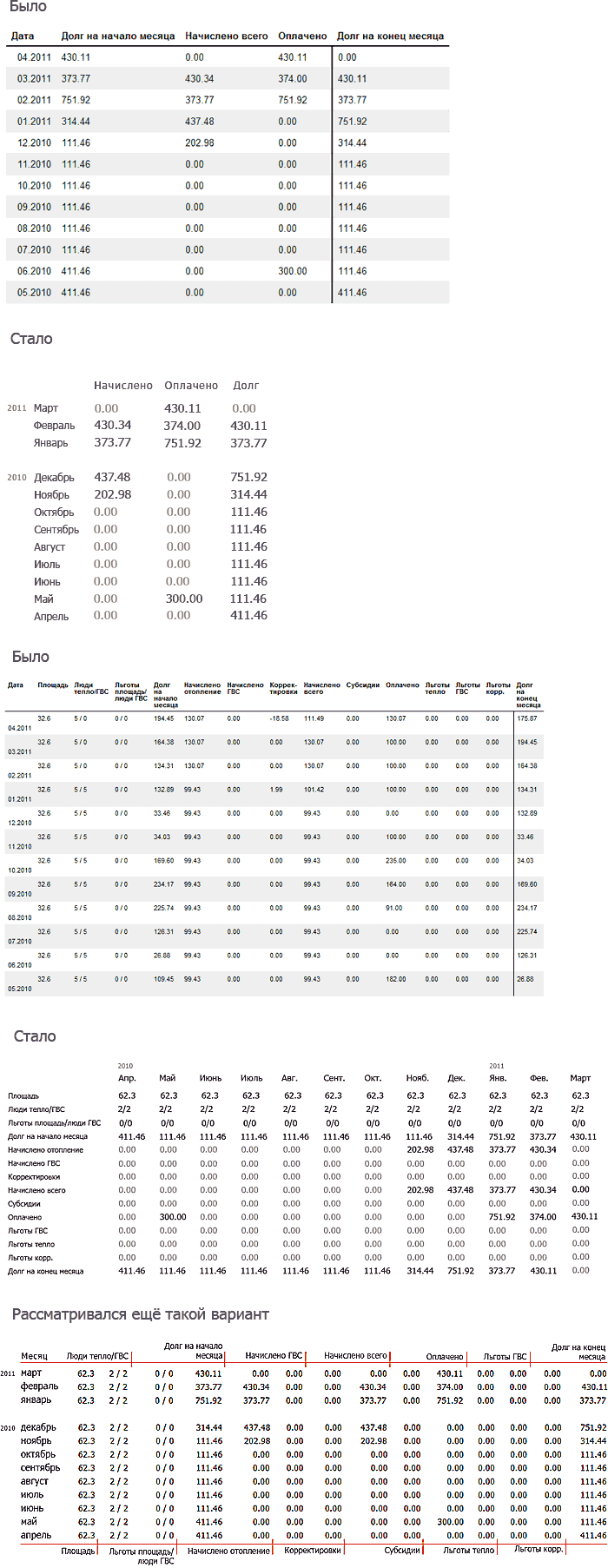 Но вся каша в таблицах — следствие бредового и непостижимого подхода. Я бы всерьёз подумал о том, чтобы вообще изменить его, отказаться от бессмысленных «месяцев» и «долгов» и использовать конкретные даты, операции и баланс. Почему-то все, кроме коммунальщиков, делают именно так, и у них всегда всё понятно.